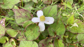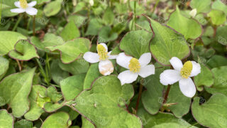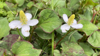 やや湿り気のある林床や日陰地に生育している多年生草本植物のドクダミ。基部に白い花びらのような苞が4枚つくため、花の集まりが1個の花のように見える。